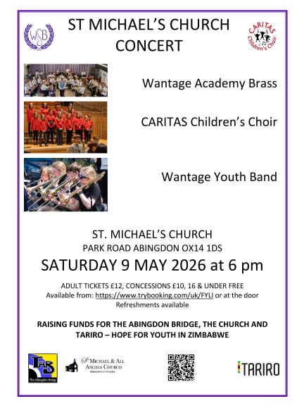 Wantage Academy Brass and Caritas Children's Choir return to St Michael's for another concert in this popular series, this year accompanied by Wantage Youth Brass. This is a fund-raising event for The Abingdon Bridge (TAB), TARIRO – Hope for Youth in Zimbabwe and St Michael's Church. Tickets are available on-line, https://www.trybooking.com/uk/FYLI, and at the door. Adults price £12, concessions £10, 16 & under free.