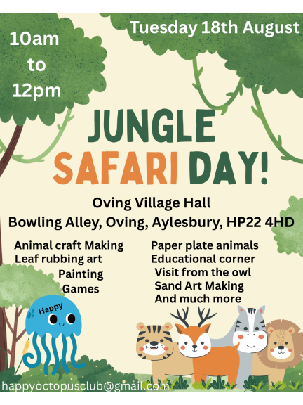 Address: Oving Village Hall, Bowling Alley, Aylesbury, HP22 4HD   FREE ENTRY – ALL EXPLORERS WELCOME   Get ready to swing, stomp, and safari your way through a morning of wild adventure at our Jungle Safari Day! Where we are bursting with colour, creativity, and jungle‑themed fun for all ages and abilities.    JUNGLE‑TASTIC ACTIVITIES AWAIT!   Your safari adventure includes:   Animal Craft Making – create your own jungle creatures   Arts and Crafts: Lots to choose and create   Leaf Rubbing Art Painting – discover textures from the rainforest   Painting & Creative Stations – unleash your inner jungle artist   Paper Plate Animals – make lions, monkeys and more   Jungle Games – fun challenges for all little explorers   Educational Corner – learn amazing animal facts   Sand Art Making – colourful creations to take home   Special Owl Visit – hold a beautiful owl and snap a photo to remember!   All craft activities are £3 each, and every masterpiece is yours to keep.    EVERYONE IS INVITED TO THE ADVENTURE   Bring your family, friends, neighbours, colleagues – the whole tribe! Drop in anytime between 10AM and 12PM.   All ages, all abilities, all locations… everyone is welcome. Wheelchairs and pushchairs are fully supported.    FACILITIES & ACCESS Toilets Disabled toilet Baby changing Wheelchair & pushchair friendly On‑site car parking Sorry, no dogs unless guide dogs Pack your curiosity, gather your explorers, and join us for a morning deep in the heart of the jungle.  Adventure awaits at Jungle Safari Day, come and join the fun