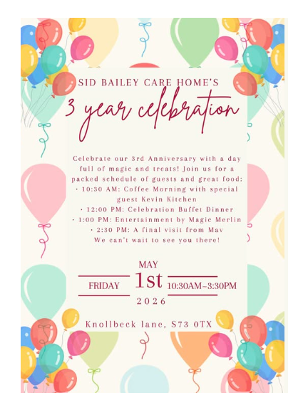 A care home in Brampton is inviting the local community to join them to celebrate a special milestone. On Friday 1st May, from 10.30am-3.30pm, Care UK’s Sid Bailey, on Knollbeck Lane, will be hosting a special party complete with live music and a magic show to celebrate three years since the home first opened its doors. On the day, there will be entertainment from circus performer Magic Merlin who will delight guests with a variety act, complete with sleight of hand tricks, balloon modelling and an interactive circus skills workshop. There will also be live music from singer Kevin Kitchen during the coffee morning, with singer Mav making an appearance in the afternoon. Both local singers will be performing a range of well-known hits from across the decades – sure to get everyone dancing. Guests and residents will be treated to a buffet dinner, with party food favourites including sandwiches, sausage rolls, quiche and desserts. The head chef is also baking a celebratory cake to mark the occasion. Victoria Alder, Home Manager at Sid Bailey, said: “We’re thrilled to be inviting the community to join us in celebrating our third birthday. It’s a fantastic opportunity for everyone to come together and celebrate everything we have achieved since our home first opened its doors. “It’s been a wonderful three years, and we’ve created a real sense of community here at Sid Bailey. We’ve welcomed some real characters into the home, built long-lasting friendships and hosted exciting events – including our community sip and paint event for Red Nose Day earlier this year! “We can’t wait to see everyone come together to enjoy the celebrations and listen to the residents share their favourite memories and achievements at Sid Bailey!” Sid Bailey is a state-of-the-art care home which has been rated Outstanding by the CQC. The home provides residential and dementia care on a permanent and respite basis. Designed to enable residents to lead active and fulfilling lives, the care home also offers its very own café, cinema room and hair salon as well as plenty of space for relaxation and recreation. To find out more about Sid Bailey, or to book your place at the event, contact 01226 818 344 or email reception@sidbaileycarehome.co.uk