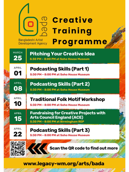 The BADA Creative Training Programme is offering a series of FREE workshops and training sessions from March to June designed to help creatives develop new skills and grow their practice.   Workshops include: ✨ Pitching Your Creative Ideas 🎙️ Podcasting Skills ✍️ Creative Writing & Poetry 🎭 Devised Theatre & Tour 🎨 Traditional Folk Motif Workshop 📸 Photography & Digital Media 📈 Digital Marketing for Creatives 💰 Fundraising for Creative Projects   📍 Birmingham venues   🎟️ All workshops are FREE but spaces are limited.   Register here: www.legacy-wm.org/arts/bada