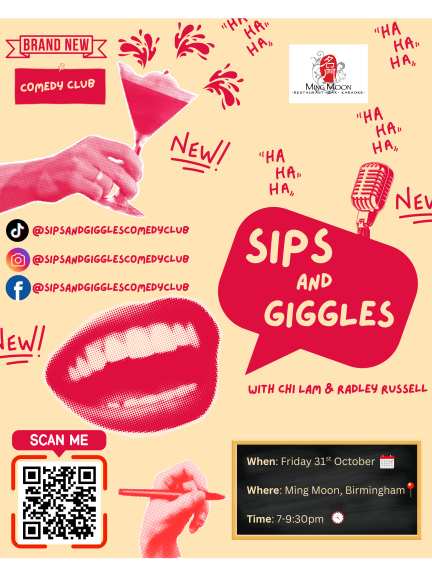 Birmingham, UK — Birmingham’s fast-growing grassroots comedy collective Sips & Giggles returns this Halloween weekend with two nights of live stand-up, great food, and good vibes — kicking off with an intimate open mic in Moseley, followed by a full-scale comedy showcase at Ming Moon in Chinatown.