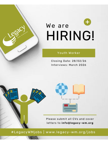 🚨 We’re Hiring – Youth Worker (West Midlands) 🚨   Are you passionate about empowering young people and making a real difference in your community? Legacy WM is looking for a dedicated Youth Worker to join our team.   📅 Closing Date: 28/02/2026 📍 Interviews: March 2026   📧 Send your CV & cover letter to: info@legacy-wm.org   If you’re experienced in youth engagement, mentoring, community outreach, or youth development, we’d love to hear from you!   🔗 Learn more here: www.legacy-wm.org/jobs