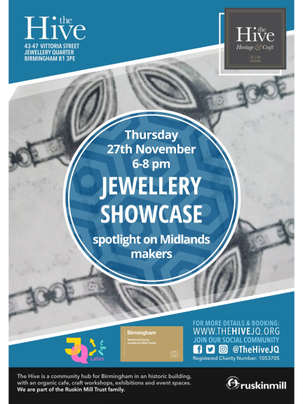 Celebrating some of the amazing jewellery makers from across the Midlands, showcasing their work and practices throughout the Hive for this JQ Lates event. Come and meet them to find out more about their journey, buy some of their pieces, or commission something unique. Join our new Jeweller in Residence, Julie Smith of Star23, to have a go at texturing or stamping a piece of jewellery to take away, for you or as a gift for someone you love; the gallery will feature artwork produced in sessions funded by the JQCommon Room, and the café will be serving a light supper menu.