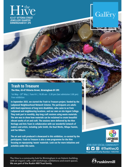 In September 2025, we started the Trash to Treasure project, funded by the Ladywood Neighbourhood Network Scheme. The participants are adults with lived experiences of long term disabilities, who came to us from Ladywood and neighbouring locations, and our own on site Argent College. They took part in monthly, day-long craft sessions using waste materials. The aim was to show how materials can be reclaimed to create beautiful vibrant works of art and craft. The sessions were delivered by the Hive Heritage and Arts Team in collaboration with our wonderful network of makers and artists, including: Julie Smith, the Dual Works, Nilupa Yasmin, and Fae Kilburn.    The art and craft produced is showcased in this exhibition, co-curated by the participants. Trash to Treasure is also a new programme for the Hive focusing on repurposing ‘waste’ materials. Look out for more initiatives and activities under this name.