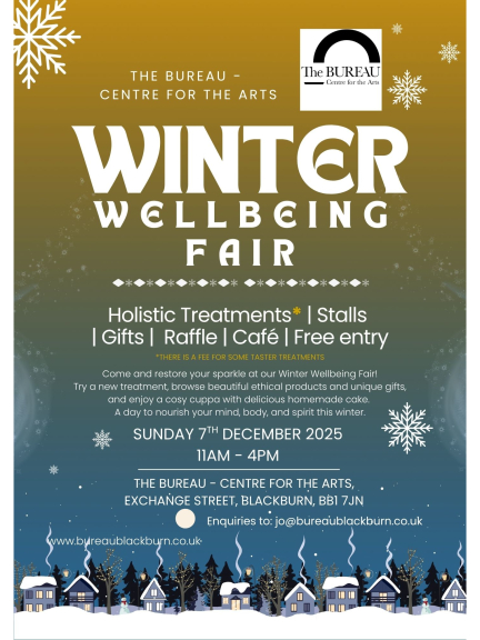 The Bureau Centre for the Arts invite you to attend our first ever Winter Wellbeing Fair When: Sunday 7th December 2025 from 11am - 4pm. Where: The Bureau Centre for the Arts, 5 Exchange Street, Blackburn, BB1 2JN Come and restore your sparkle at our Winter Wellbeing Fair! Try a new treatment, browse beautiful ethical products and unique gifts, and enjoy a cosy cuppa with delicious homemade cake. A day to nourish your mind, body, and spirit this winter with: *A variety of Holistic Mini Treatments* (Fee will apply)* *Stalls selling ethical unique gifts* *Raffle and prizes to be won* *Café with hot and cold drinks and delicious homemade cakes* *Free entry* For enquiries please contact jo@bureaublackburn.co.uk