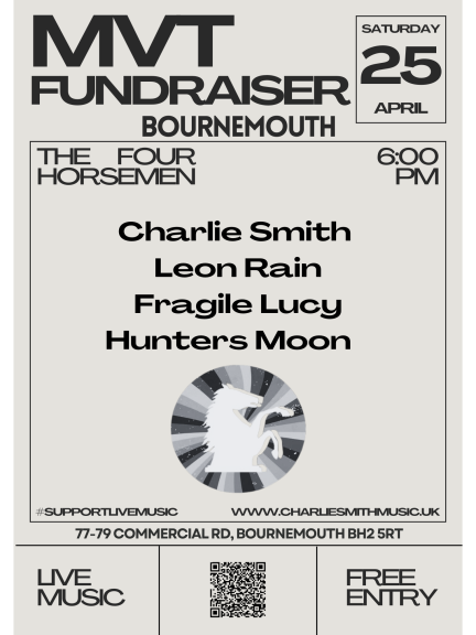 Hi, I'm Charlie Smith, an Alternative Acoustic artist from Hampshire, UK. In April, I will be embarking on my spring tour fundraising for the Music Venue Trust. This will include six different grassroots music venues around England. Join us on Saturday, the 25th of April, for a fundraising special at the Four Horsemen pub's main bar. Come along and support local independent music.