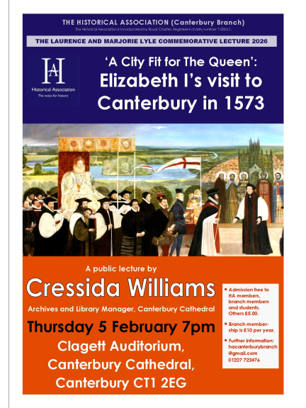 Keeping with the local history theme of our annual Lyle Lectures, Cressida will examine Elizabeth I’s visit to Canterbury in September 1573 which included the Queen’s 40th birthday celebrations.