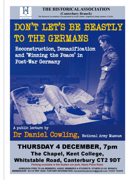 Dr Cowling’s talk will investigate the aims, aspirations, and some of the problems that came to the fore during the British occupation of Germany after World War II.