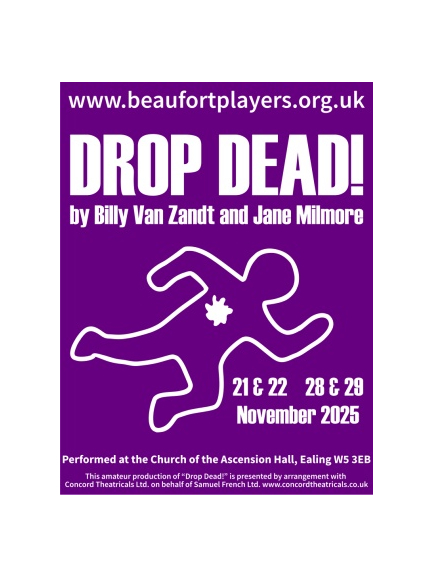 As a host of wannabe actors and faded stars gather to revive their fortunes in the clichéd murder mystery “Drop Dead!”, their hopes of stardom are pinned on the talents of ego-centric director Victor Le Pewe. But as the dress rehearsal descends into chaos, and the number of deaths exceeds those in the script, can the put-upon thespians solve the mystery and survive until the final curtain? Whatever happens, the show must go on...