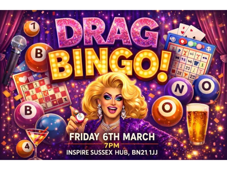 Inspire Sussex Hub, BN21 1JJ Please contact olivia@inspiresussex.org.uk to book tickets at £15 per ticket!   Purchase Tickets on Eventbright https://www.eventbrite.com/e/drag-bingo-at-inspire-tickets-1981848924483   Come for the bingo, stay for the chaos — and help us raise funds while doing it