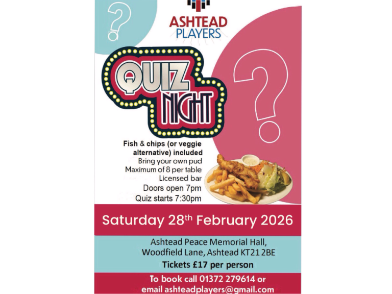 Saturday 28th February, Ashtead Peace Memorial Hall, starting at 7:30pm. Doors open at 7pm.