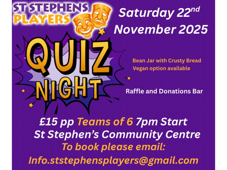 Description: A lively, cheeky quiz night hosted by the St Stephens Players, featuring themed rounds, group banter, and plenty of laughs. Open to all — come for the trivia, stay for the roasts.