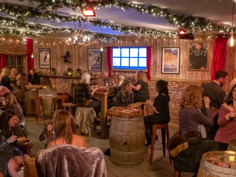 In winter, our terrace is transformed into a stylish and cosy Alpine Lodge complete with snowy scenery and everything you’d want in an après ski experience. Rustic wooden walls and a flickering fire, barrel tables, skis, sledges, and sofas with chunky rugs and fleeces set the scene for a festive celebration.