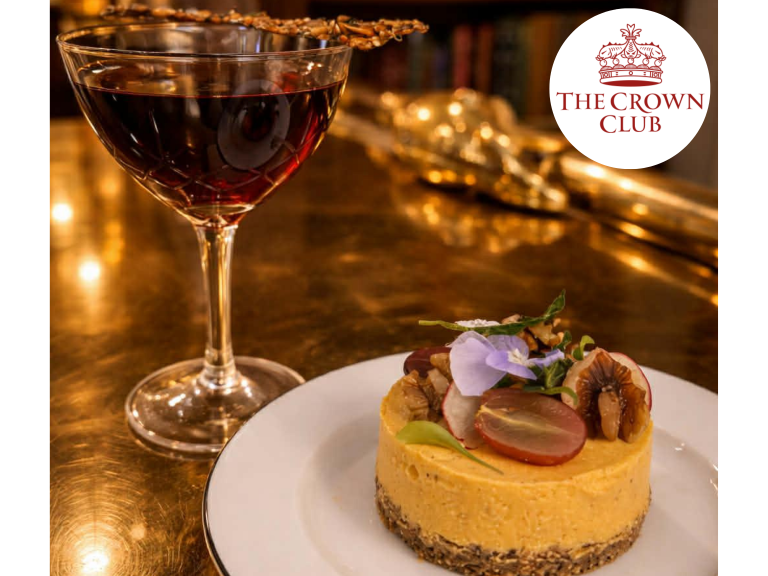 Spiced butternut savoury cheesecake paired with a unique Crown Club Boulevardier showcasing Havanna 7 rum, homemade spiced vermouth and orange bitters.