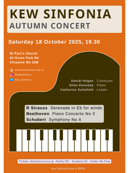 Kew Sinfonia is delighted to announce our autumn concert, marking the start of our 2025/26 season and our 40th anniversary year. This concert showcases Romantic and Classical works by three of the greatest German composers – Richard Strauss, Beethoven and Schubert.
