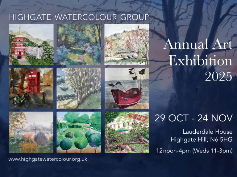 The exhibition across two gallery floors will include artwork from the group’s visits across north London, painting en plein air in Highgate, Hampstead, Alexandra Palace, Holland Park and Central London, plus landscapes and seascapes from further afield. Expressive floral paintings, contemplative still lifes and abstracts will also be on show, with a small works section comprising miniature masterpieces at minimal prices. With diverse themes and a range of artistic styles, there will be something for all to enjoy.