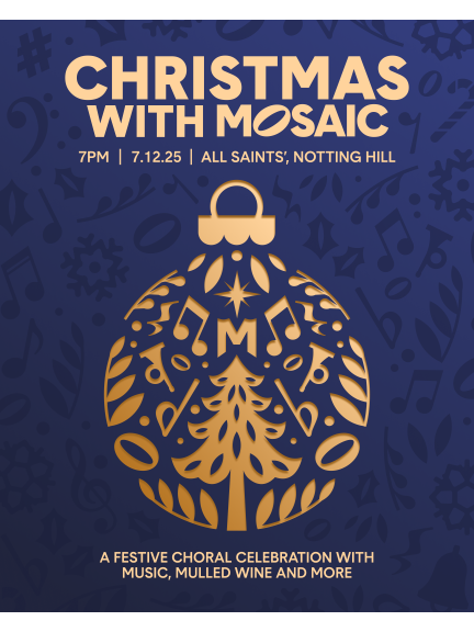 The concert will be held at All Saints’ Church Notting Hill at 7pm (entrance on Clydesdale Road). Doors open at 6.30pm and seating is unreserved. Full details can be found here: https://www.eventbrite.co.uk/e/christmas-with-mosaic-tickets-1751422785699?aff=oddtdtcreator