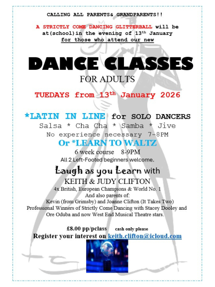 A STRICTLY COME DANCING GLITTERBALL will be at(school)in the evening of 13th January