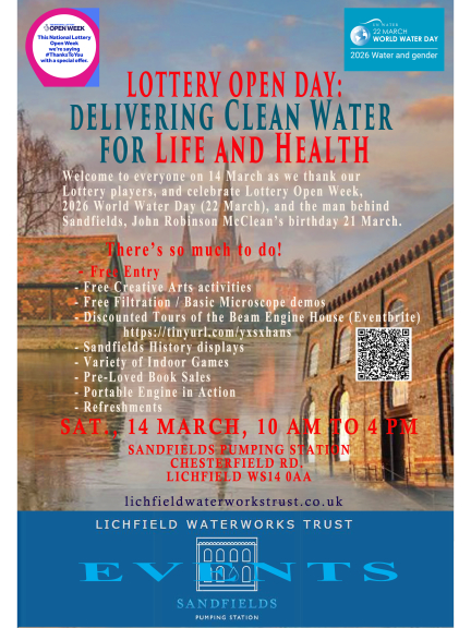 Welcome to everyone on 14 March as we thank our Lottery players, and celebrate Lottery Open Week, 2026 World Water Day (22nd March), and the man behindSandfields, John Robinson McClean - whose birthday we celebrate on 21st March.