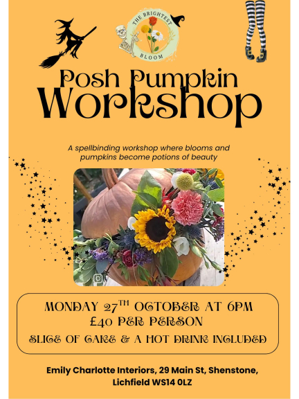 Join Emily Charlotte’s Interiors in Shenstone for a special Posh Pumpkin Workshop at The Brightest Bloom Florist.