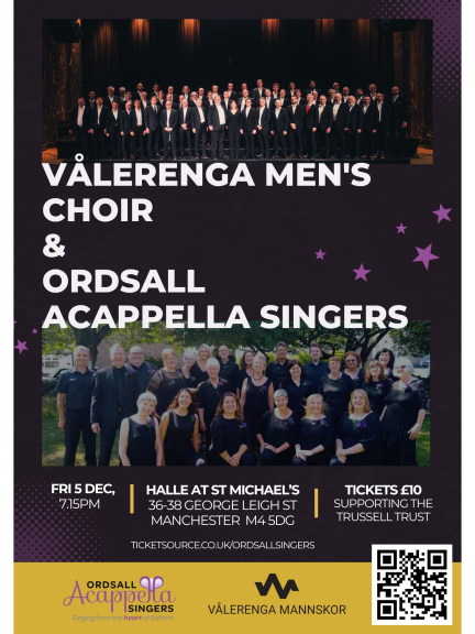 Acclaimed Salford choir, Ordsall Acapella Singers welcome Oslo-based Vålerenga Mens Choir to Manchester for a joint festive concert.