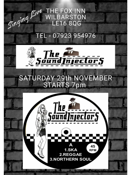 The SoundInjectors are coming to Wilbarston - a night of SKA, REGGAE & NORTHERN SOUL Will definitely be yet another night to remember at THE FOX INN! Sat 29th Nov.@ 19.00