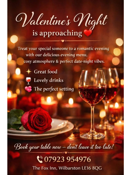 If you're looking for somewhere to treat your special someone this Valentine's Day, book a table at The Fox Inn, Wilbarston and enjoy a romantic evening with great food, and a cosy atmosphere.