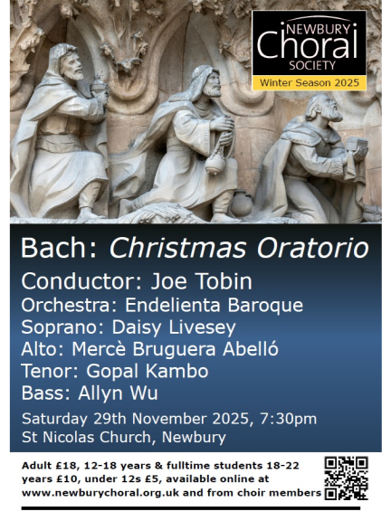 After the well-received venture into the contemporary music of McDowall and Chilcott in the summer, the Christmas offering from the Newbury Choral Society is a return to more traditional fare with J S Bach’s Christmas Oratorio. The six cantatas which make up the Christmas Oratorio were written to celebrate the Christmas feast days of 1734 to 1735. For many the work has a more direct appeal than the two great passions and the B Minor Mass, unhindered by lengthy periods of recitative or dialogue. From the exultant opening chorus we are led to moments of deep reflection and arias of great beauty.