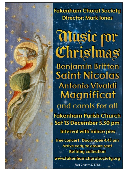 Join Fakenham Choral Society for their annual Christmas Concert, featuring Britten's St Nicolas, Vivaldi's Magnificat and other seasonal favourites. Free entry (with a retiring collection), so don't be late! What a wonderful way to start your Christmas festivities.