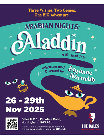 The Dales Music and Drama Group presents Arabian Nights: Aladdin, an original retelling of the story of Aladdin, written and directed by Suzanne Norwebb. With performances from 26th - 29th November 2025 at The Dales United Reformed Church.