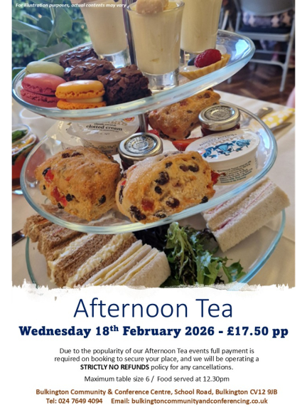 Afternoon Tea. Price £17.50 per person or £21.50 to include a mini bottle of Prosecco. Doors open at 12:00 noon, food served at 12:30pm. Maximum table size 6. Allocated Seating. Fundraising Raffle. Full payment is required at time of booking. Strictly no refunds.