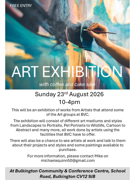 This will be an exhibition of works from Artists that attend some of the Art groups at BVC.