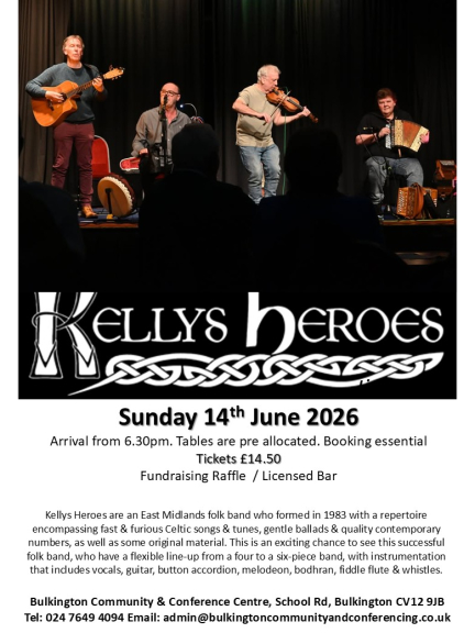 Kelly's Heroes are an East Midlands folk band who formed in 1983 with a repertoire encompassing fast and furious Celtic songs and tunes, gentle ballads and quality contemporary numbers, as well as some original material. This is an exciting chance to see this successful folk band, who have a flexible line-up from a four to a six-piece band, with instrumentation that includes vocals, guitar, button accordion, melodeon, bodhran, fiddle and flute & whistles.