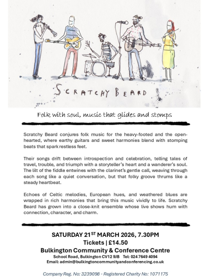 Scratchy Beard conjures folk music for the heavy footed and the open hearted, where earthy guitars and sweet harmonies blend with stomping beats that spark restless feet. Their songs drift between introspection and celebration, telling tales of travel, trouble, and triumph with a storytellers heart and wanderers soul. The lilt of the fiddle entwines with the clarinets gentle call, weaving through each song like a quiet conversation, but that folky groove thrums like a steady heartbeat. Echoes of Celtic melodies, European hues, and weathered blues are wrapped in rich harmonies that bring this music vivdly to life. Scratchy Beard has grown into a close-knit ensemble whose live shows hum with connection, character, and charm.