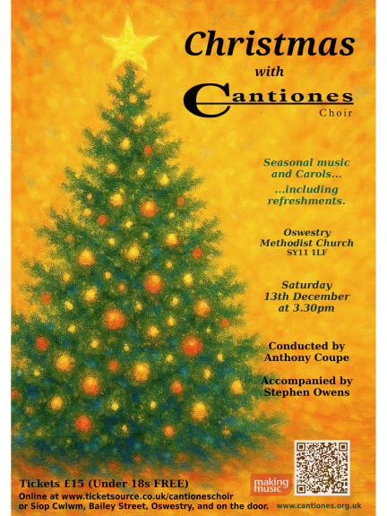 Tickets are £15 (U18s entry is free) and are available from Siop Cwlwm in Bailey Street, Oswestry, on the door on the day and online at https://www.ticketsource.co.uk/cantioneschoir