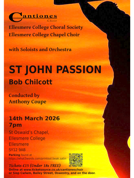 Cantiones will join Ellesmere College Choral Society and Ellesmere College Chapel Choir to present Bob Chilcott's dramatic St John Passion. It should be emotional, with the benefit of having a small orchestra featuring a large brass section and excellent soloists. In addition each choir will present individual items to showcase their skills. All in all this should be a concert not to be missed.