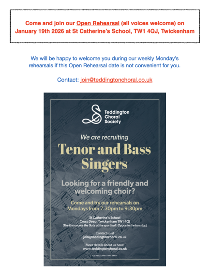 What a better way to come and try us than joining our OPEN REHEARSAL (all voices welcome) on Monday January 19th from 7:30pm to 9:30pm (please arrive at 7:15pm) at St Catherine's School, Cross Deep, TW1 4QJ, Twickenham.