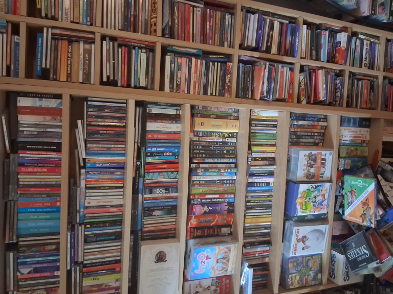 A large amount of cds dvds books. Clothes for sale