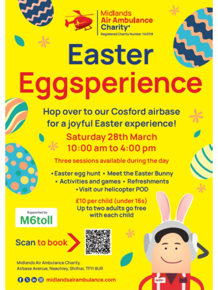 Activities include an Easter egg hunt, the chance to meet the Easter Bunny, games, refreshments and a visit to our helicopter POD. All proceeds fund lifesaving missions in Shropshire.