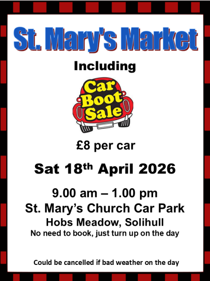 St. Mary's Market and Car Boot Sale takes place on Saturday 18th April between 9.00 am - 1.00 pm. This this is the perfect chance to make yourself some money after you have Spring cleaned the house. No need to book your space, just turn up on the day. We only charge £6 per car. Refreshments are available in the church.