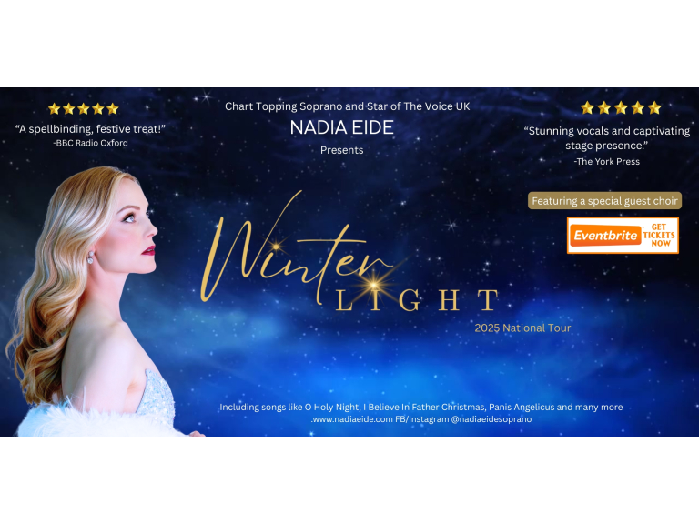 Nadia catapulted to fame when she appeared on ITV as the only classical singer on The Voice UK 2021. Her four- and-a-half octave range blew the coaches away securing her spot as a finalist of Team will.i.am. Critically acclaimed on stage as an opera and musical theatre star, she is now breaking the mould of the classical crossover genre, receiving standing ovations for her concert shows. This November and December she is touring her hugely successful Christmas concert tour Winter Light, which is taking place in beautiful churches and cathedrals around the UK this Christmas.