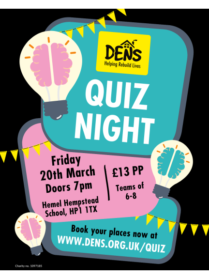 Get your team together and test your knowledge with a night of challenging trivia questions whilst supporting your local homeless charity. Doors open at 7pm for a 7.30pm start. We hope to see you there! To register your team please visit www.dens.org.uk/quiz
