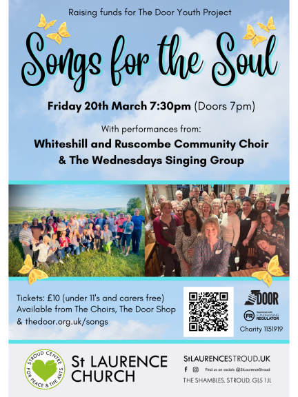 Songs for the Soul is being performed on Friday, 20th March at 7:30pm, and organised by choir leaders, Louise Johnson and Luc Bailey. It’s a collaboration of shared voices for a shared purpose: The Door Youth Project. Tickets are £10 (free to under-11s and carers) and available from The Door shop, High Street, Stroud, the choirs, thedoor.org.uk/songs, or on the day. All proceeds will go to The Door, supporting its vital work with young people in the Stroud and North Cotswold areas.