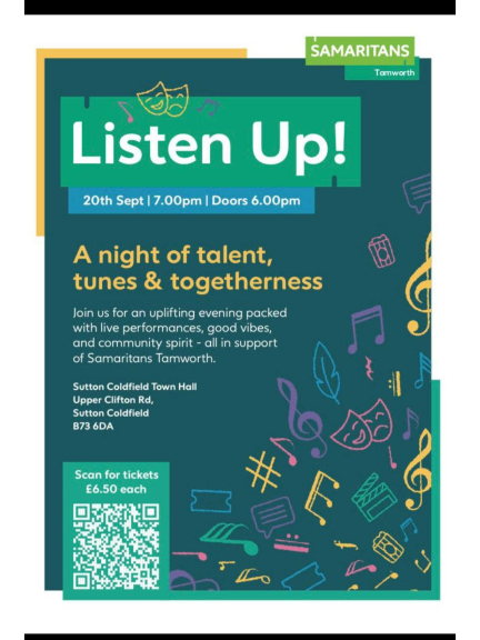 Tamworth Samaritans is an independent charity that has over 100 unpaid volunteers working to help those in distress, in need of emotional support or just someone to listen to them without judgement or prejudice. They offer many services such as 24hour free call helpline, school services, prison outreach, Tamworth Rail station, and have been engaging with the Tamworth, Lichfield, Burton and surrounding areas since 1976.