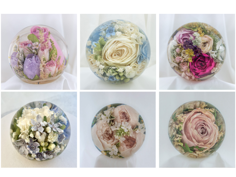 The workshop specialises in transforming bouquets into elegant paperweights, homeware, and jewellery. Each piece is carefully handcrafted, capturing the colour and beauty of the original flowers.
