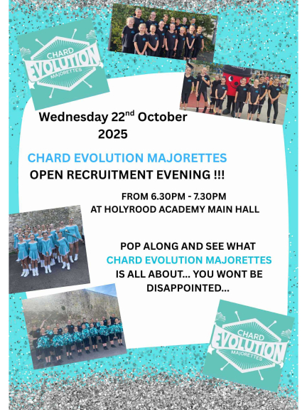 Wednesday 22nd October 2025 Open Recruitment Evening from 6.30pm until 7.30pm at Holyrood Academy Main Hall….pop along and see what Chard Evolution Majorettes is all about….you won’t be disappointed 💜💙