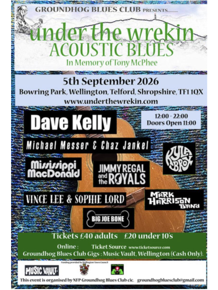 The Groundhog Blues Club will be hosting the first Under the Wrekin - Acoustic Blues Event at the beautiful Bowring Park, Wellington, under the shadow of the wonderful Wrekin. Housed inside a large marquee the blues and good vibes will be flowing, all in memory of UK blues legend Tony McPhee, who was a Wellington resident for many years.