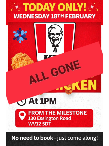 On Wednesday 18th February Community Matters CIC in Willenhall held a KFC chicken foodbank at The Milestone in New Invention, walsall.