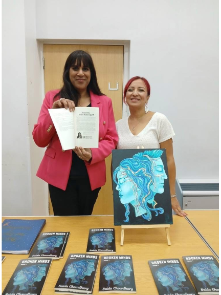 The book launch saw the artwork of Christiane Jenkins of SUIT (Service User Involvement Team Wolverhampton) being displayed for everyone to see. This piece of art had been gifted to be the front cover for ‘Broken Minds’. Everyone commented on how beautiful it was, especially the gold leaf picking up the light from which ever angle you looked at it from. The book launch was a success, with the Deputy Mayor purchasing a copy and Sureena Brackenridge who had written the Foreword for ‘Broken Minds’ could finally see it in print. She explained how moving she finds Saida’s poetry and revealed how she would be sitting down with the book later that evening and encouraged everyone to purchase a copy.