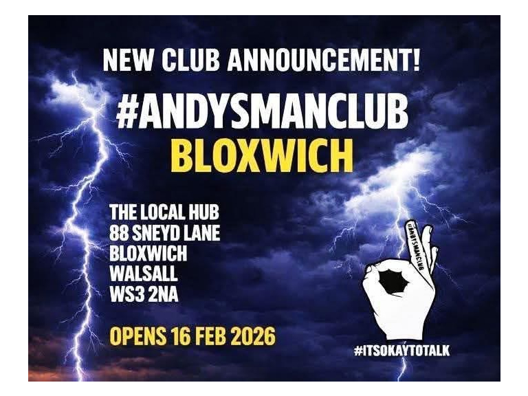 Going through a storm or just been through one? Andy`s Man Club are talking groups for men to help you through your storms. A new club opened at The Local Hub in Bloxwich on 16th February. Andy`s Man Club meets every Monday at 7pm except bank holidays.